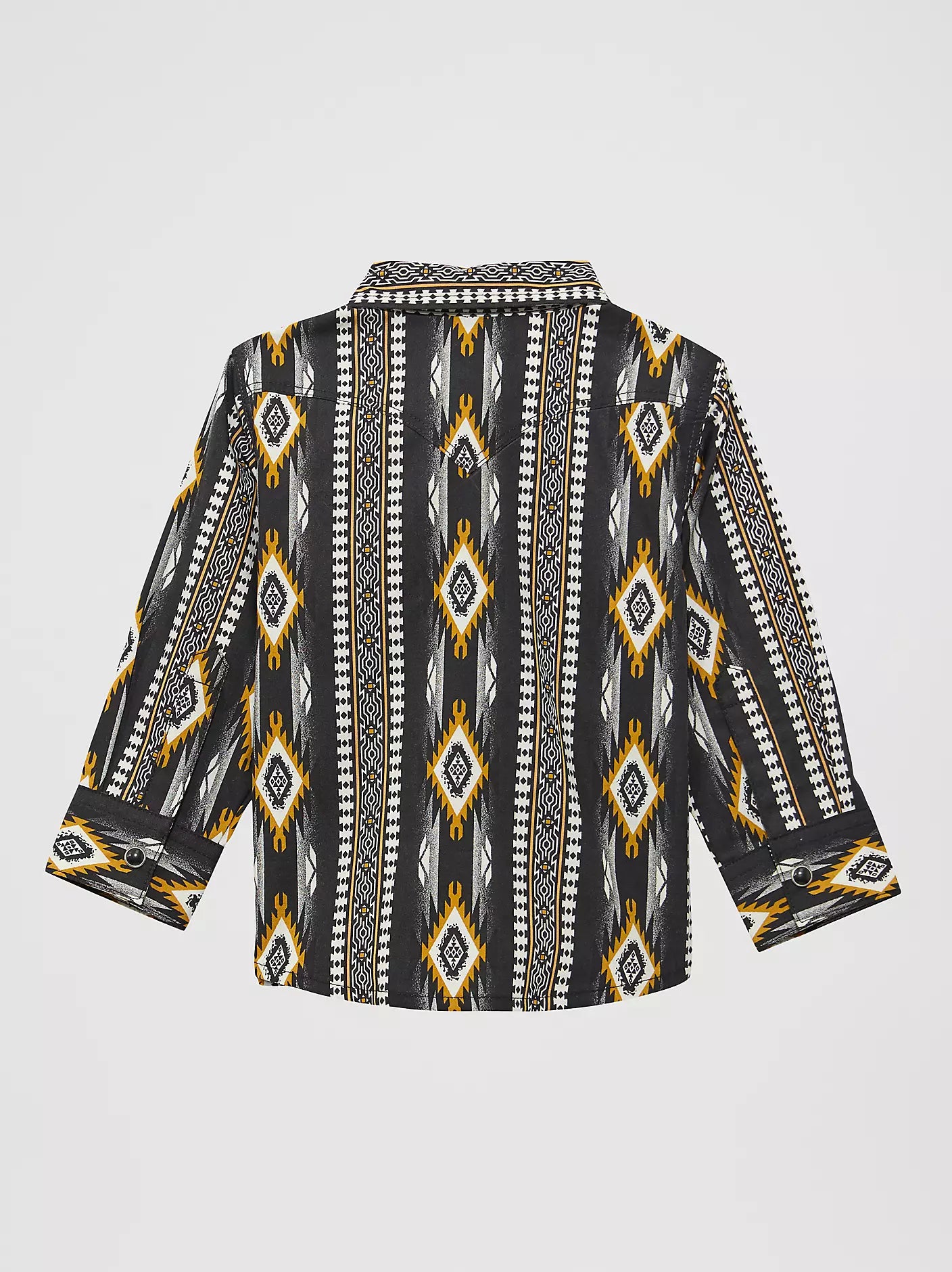 It's never too soon to get your little cowboy dressed up in your favorite Western styles. This Wrangler® baby and toddler boys' Western shirt combines all the classic features you know and love with a comfy cotton silhouette perfect for your little one. The shirt has Western-style yokes and flap chest pockets, our signature 'W' stitching, iconic pearl snap buttons, and a striking southwestern print. Dress him up in this stylish cowboy shirt and add a pair of baby boys' Wrangler jeans for the ultimate in kids' Western wear.