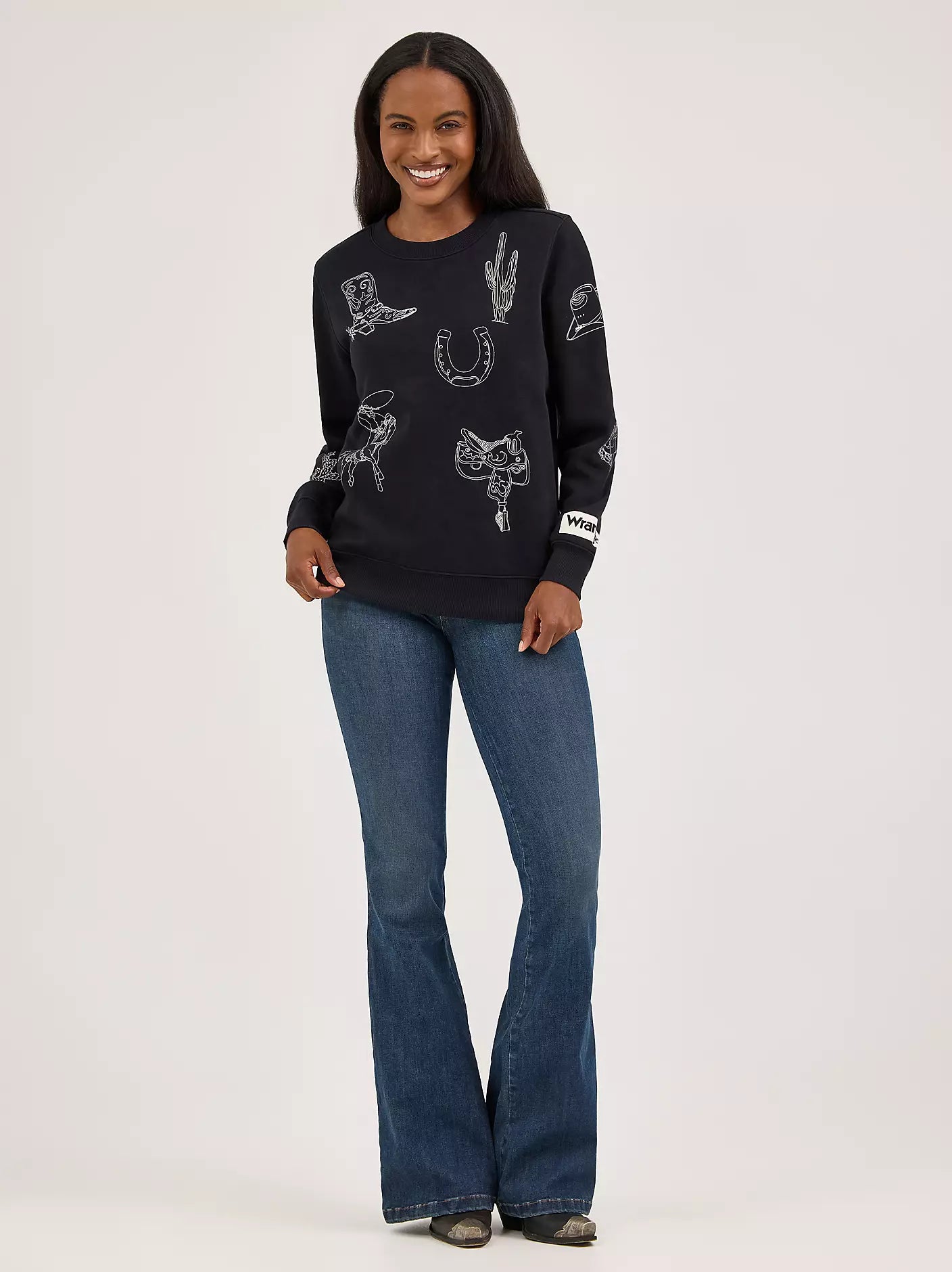 Perfect for coming out of hibernation, the Women’s Wrangler Retro® Cowboy Icons Pullover is sure to keep you cozy. It’s crafted from a soft fabric blend for comfort and warmth. This classic crewneck sweatshirt comes with Western-inspired line artwork of boots, horseshoes, saddles, bronc riders, bison, and more. Ready to be bundled up? This relaxed fit pullover has your back.