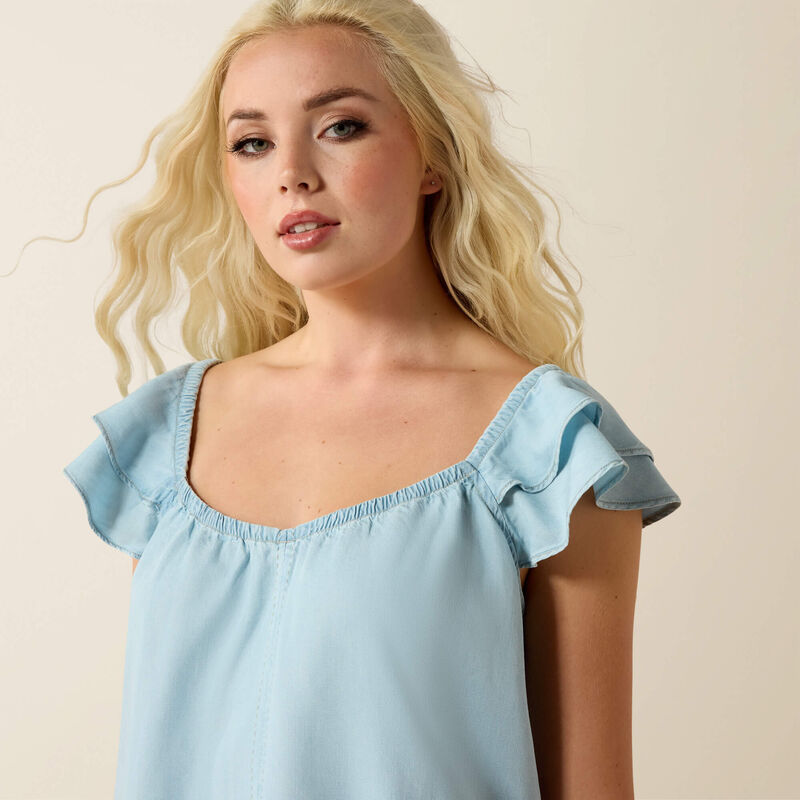 Add a little softness to your springtime wardrobe. Romantic and feminine, this tiered-ruffle sleeve top features an elastic neckline that can be worn on and off the shoulders.