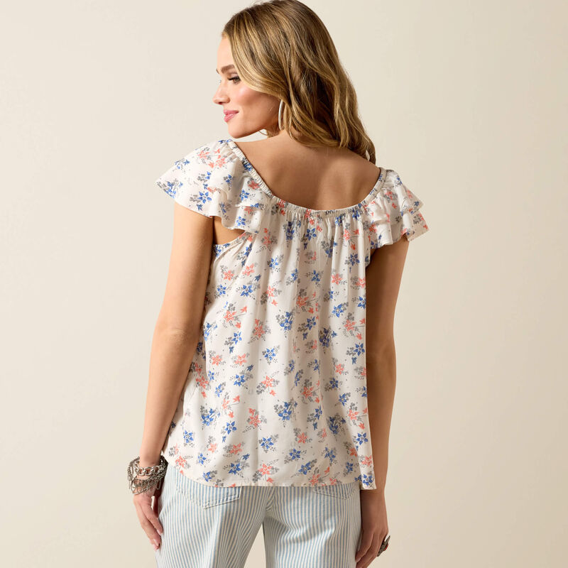 Add a little softness to your springtime wardrobe. Romantic and feminine, this tiered-ruffle sleeve top features an elastic neckline that can be worn on and off the shoulders.