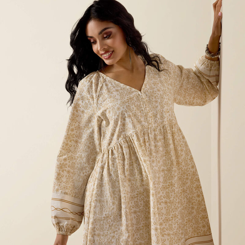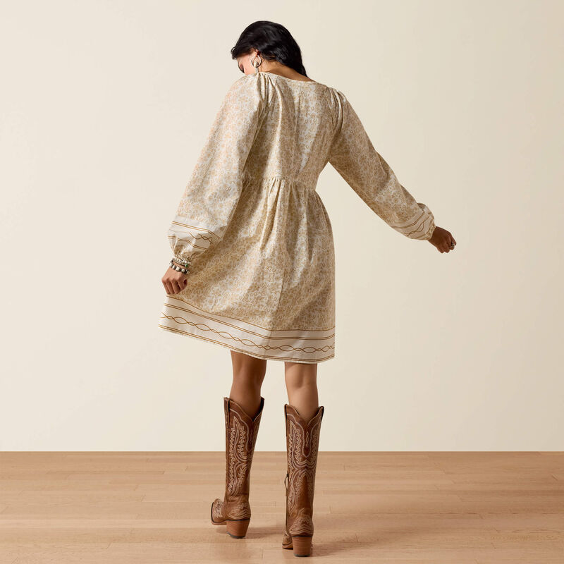 An elevated take on the A-line dress with border print detailing. Drapey fabric and elastic cuffs add to its summery vibe. Pair it with sandals for a seaside stroll, or throw on your fave boots and you're festival ready.