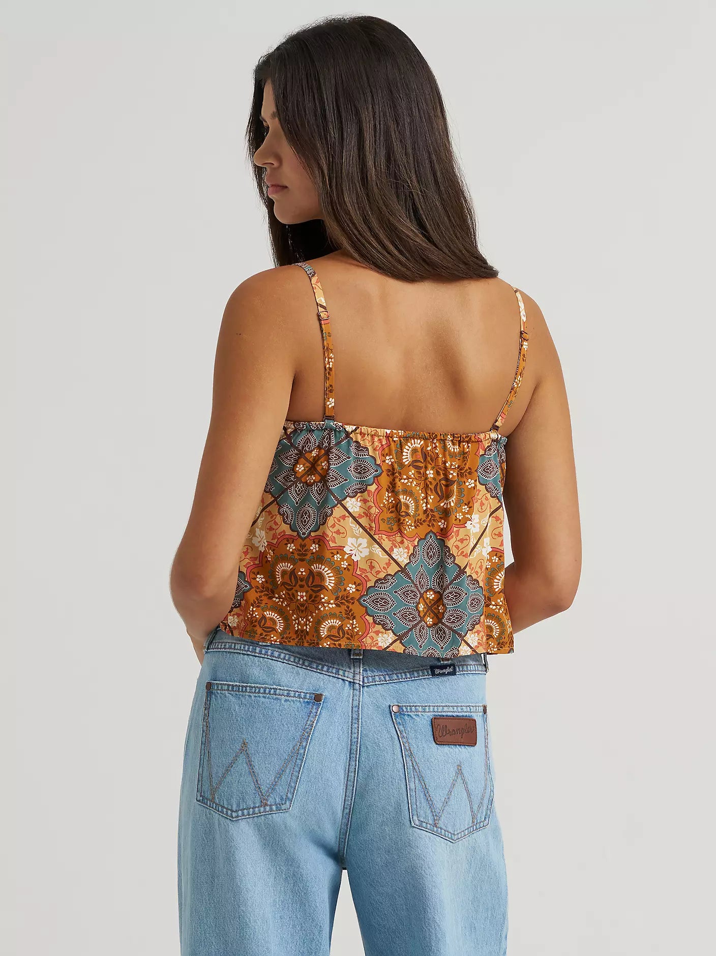 Show off your Western spirit anytime the sun is shining in this Wrangler Retro® Bandana Spaghetti Tank. Designed for softness and all-day comfort, this lightweight statement piece is a summertime essential—perfect on its own or layered for extra style. A bold floral bandana print stands out in any setting, while adjustable straps ensure a just-right fit. Bonus: the straps are removable, and this top stays in place thanks to hidden silicone grips. The angled hem adds a flattering finish that pairs with your favorite denim.