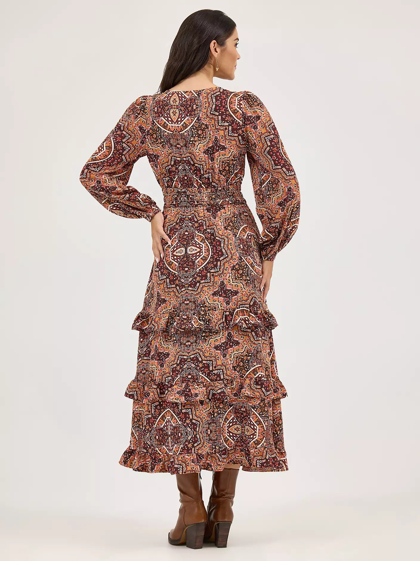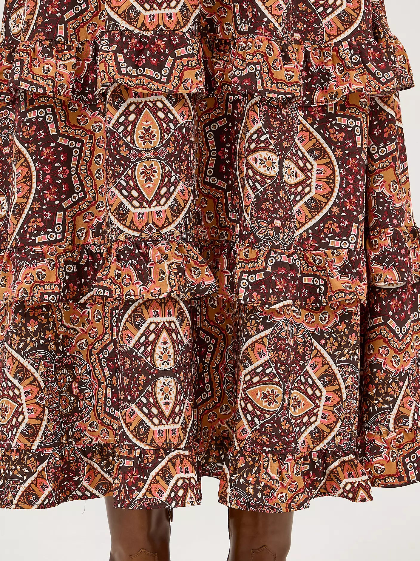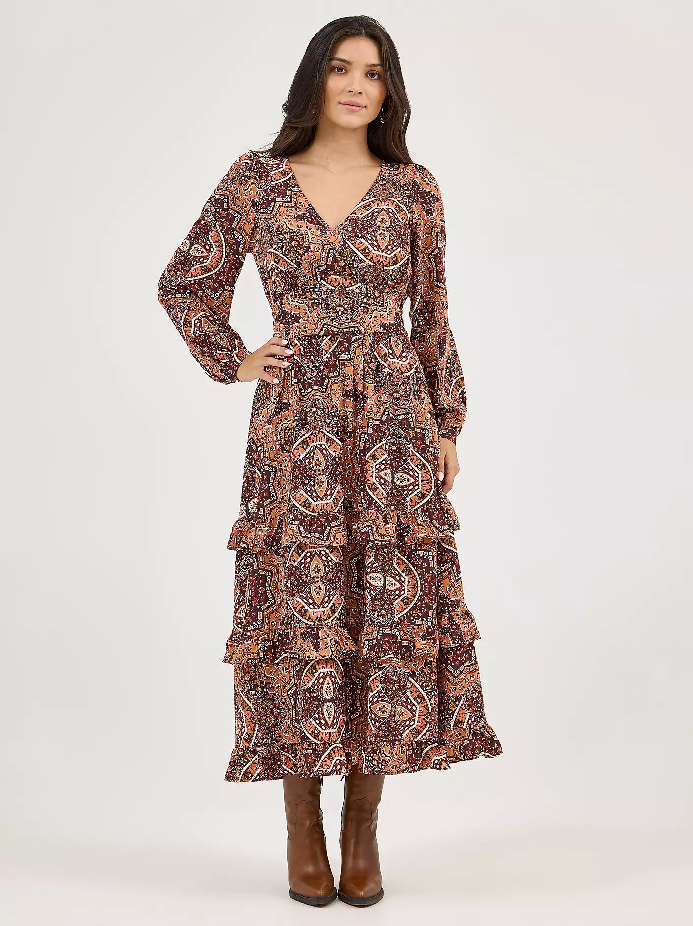 In Wrangler's Ruffle Accent Maxi Dress, you’ll always impress. It’s made of a flowy, lightweight fabric you can wear in any season, with a dizzying mosaic print in brown and peachy hues. It features a sweet V-neck silhouette, billowy sleeves, as well as a long and loose tiered skirt with ruffles. All you need to complete the look is your favorite pair of cowgirl boots.