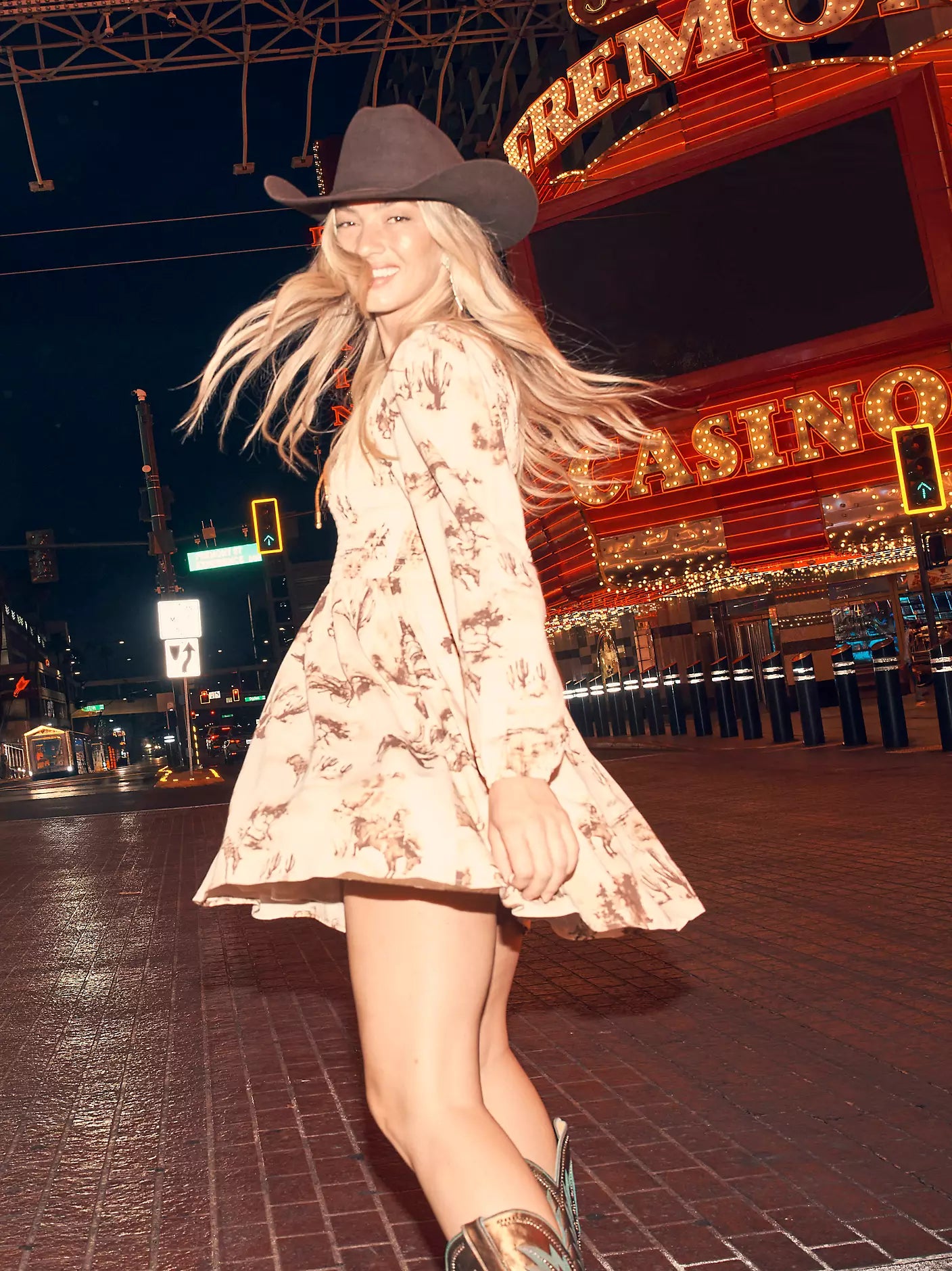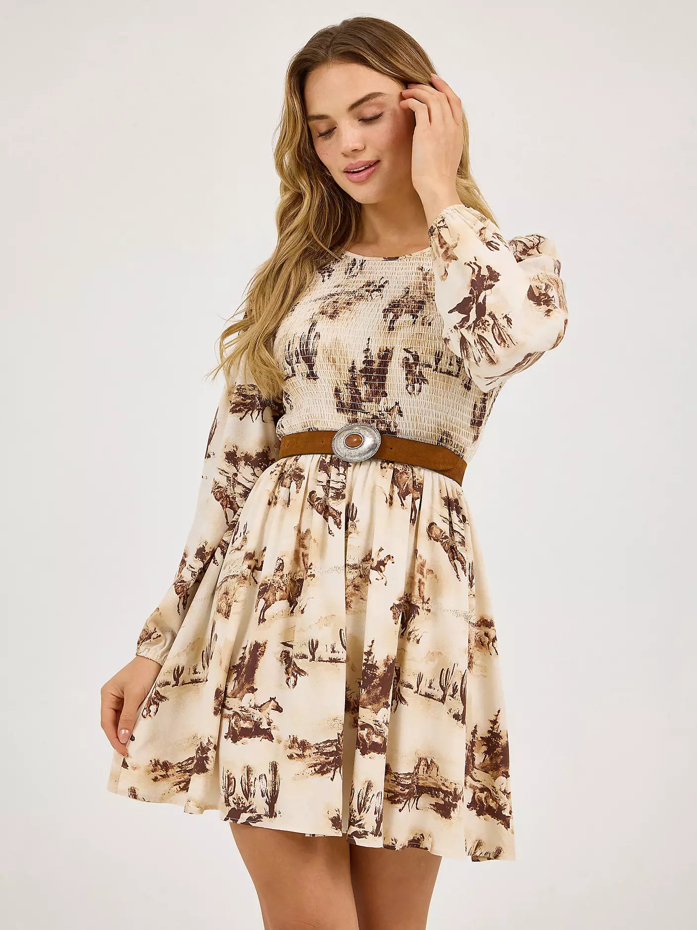 Everywhere you go, Wrangler's Western-inspired take on the A-line silhouette will have you feeling just as good as you look. It features a flaring smocked bodice, a flowy skirt that lands just above the knee, and long sleeves with a little added volume at the shoulder with elastic at the wrists.