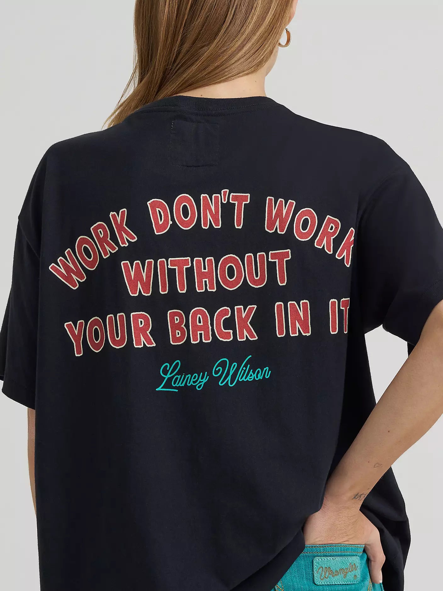 From backroads to the festival stage, this Lainey Wilson x Wrangler® Oversized Tee hits all the right notes. It features a classic crewneck silhouette, dropped shoulders, and an oversized fit for that looser, longer, more laidback vibe. Inspired by her song “Broken Hearts Still Beat," it features the lyrics “work don't work without your back in it” scrawled across the back, a vintage-inspired graphic of a bronc rider in the front, and the country music star’s signature for a personal touch.